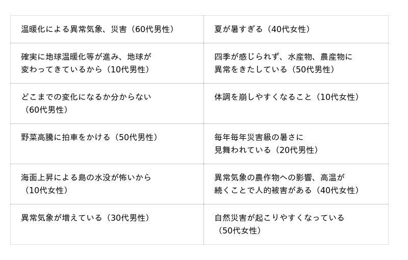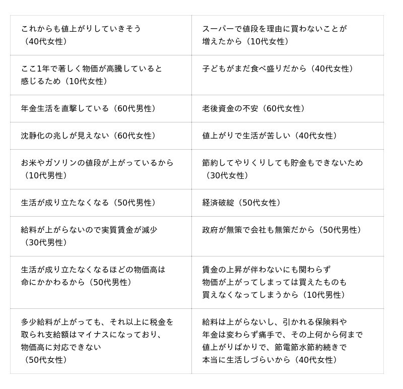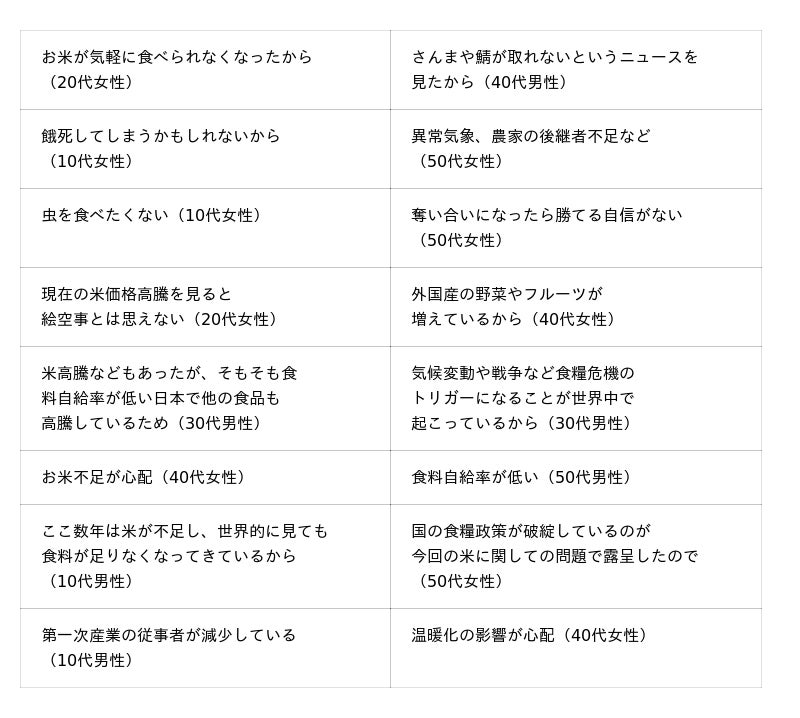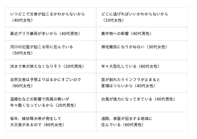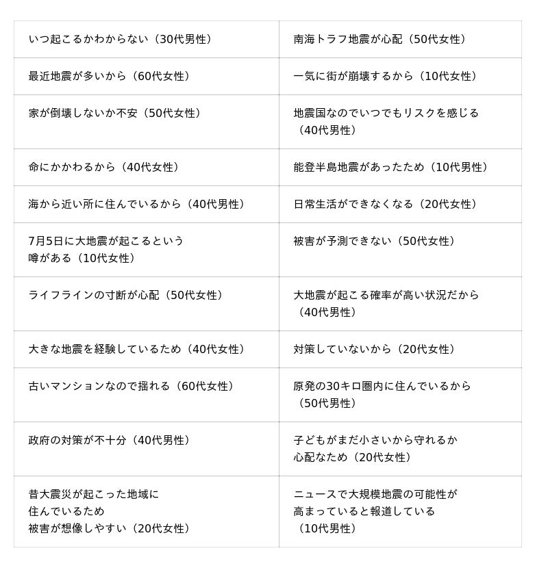 不安を感じている“身近な危機”として挙げた人に、不安な理由をそれぞれ聞いたところ、1位の物価高騰では「生活が成り立たなくなる」「値上がりで生活が苦しい」、2位の地震・津波では「7月5日に大地震が起こるという噂がある」「いつ起こるかわからない」、3位の食糧危機では「お米不足が心配」「食料自給率が低い」、4位の台風・豪雨では「年々大型化している」「台風が強力になってきている」、5位の気候変動では「異常気象が増えている」「自然災害が起こりやすくなっている」といった回答が挙げられました。