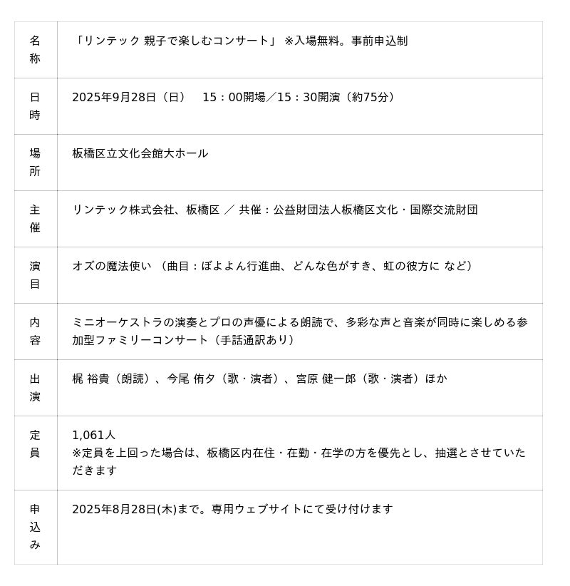 リンテック(本社:東京都板橋区 代表取締役社長:服部 真)は本社所在地である東京都板橋区と共に、「リンテック 親子で楽しむコンサート」を9月28日(日)に開催します。「絵本のまち板橋」を推進する板橋区と連携した参加型ファミリーコンサートで、2回目となる今年の演目は「オズの魔法使い」。ミニオーケストラの響きとプロの声優による朗読をお楽しみいただけます。今回も板橋区に在住・在勤・在学の方を優先的にご招待します。
