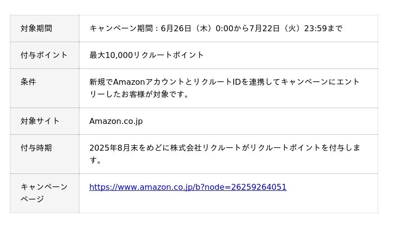 リクルートID とAmazonアカウントの新規連携で、最大10,000リクルートポイントが当たる