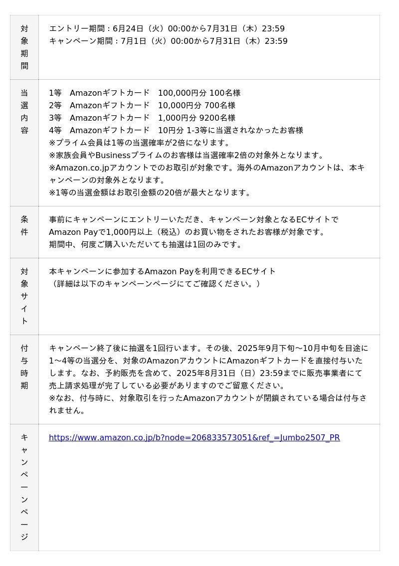 - Amazon Payを使って対象ECサイトで1,000円以上のお買い物をすると最大10万円相当の