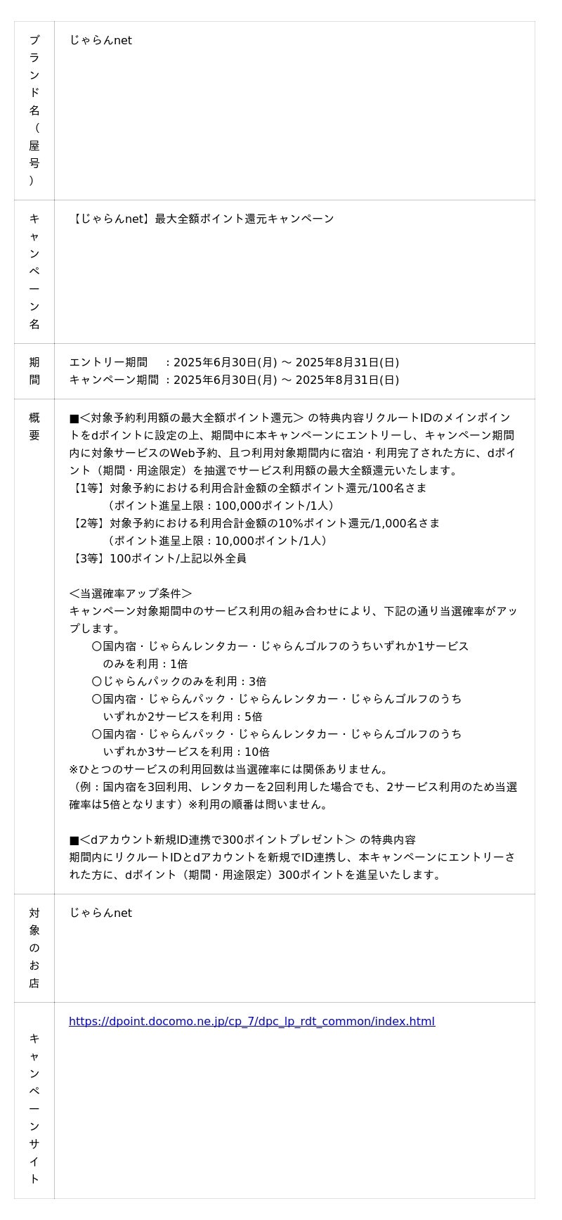 株式会社NTTドコモ(以下、ドコモ)は、株式会社リクルートが提供する旅行情報サービス「じゃらんnet」において、「じゃらんnetで最大全額ポイント還元キャンペーン」(以下、本キャンペーン)を2025年6月30日(月)から2025年8月31日(日)までの期間で開催いたします。