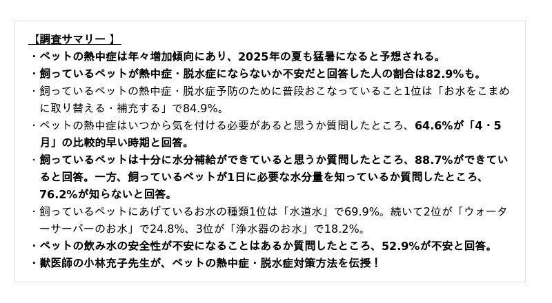 ・ペットの熱中症は年々増加傾向にあり、2025年の夏も猛暑が予想されています。アンケートの結果、飼っているペットが熱中症・脱水症にならないか不安だと回答した人の割合は82.9%もいることが判明。