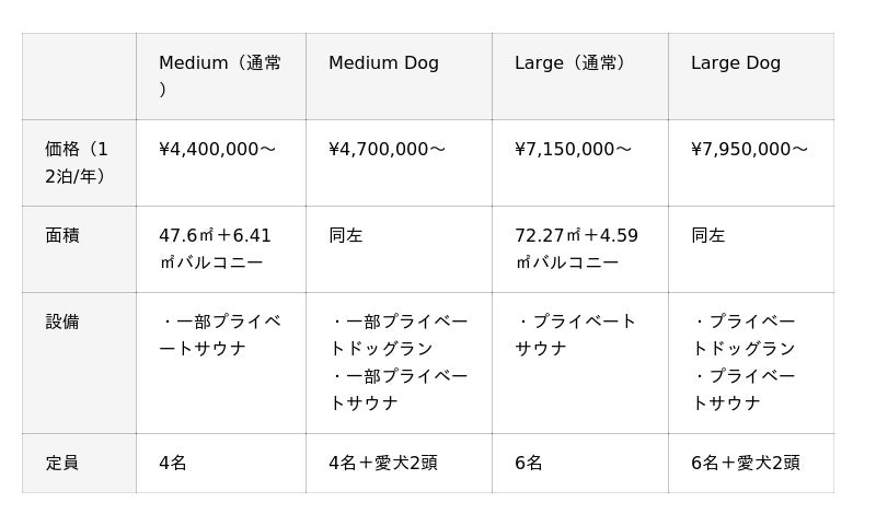 - 軽井沢2nd:Mediumサイズ/Largeサイズ(約73.6平方メートル )あり、いずれも愛犬同伴&サウナ付き