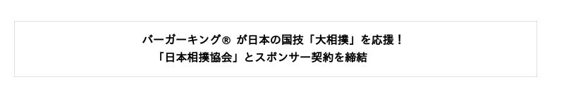 バーガーキング(R) は、公益財団法人 日本相撲協会とスポンサー契約を締結いたしました。本契約により、七月場所より公益財団法人 日本相撲協会への協賛を行ってまいります。