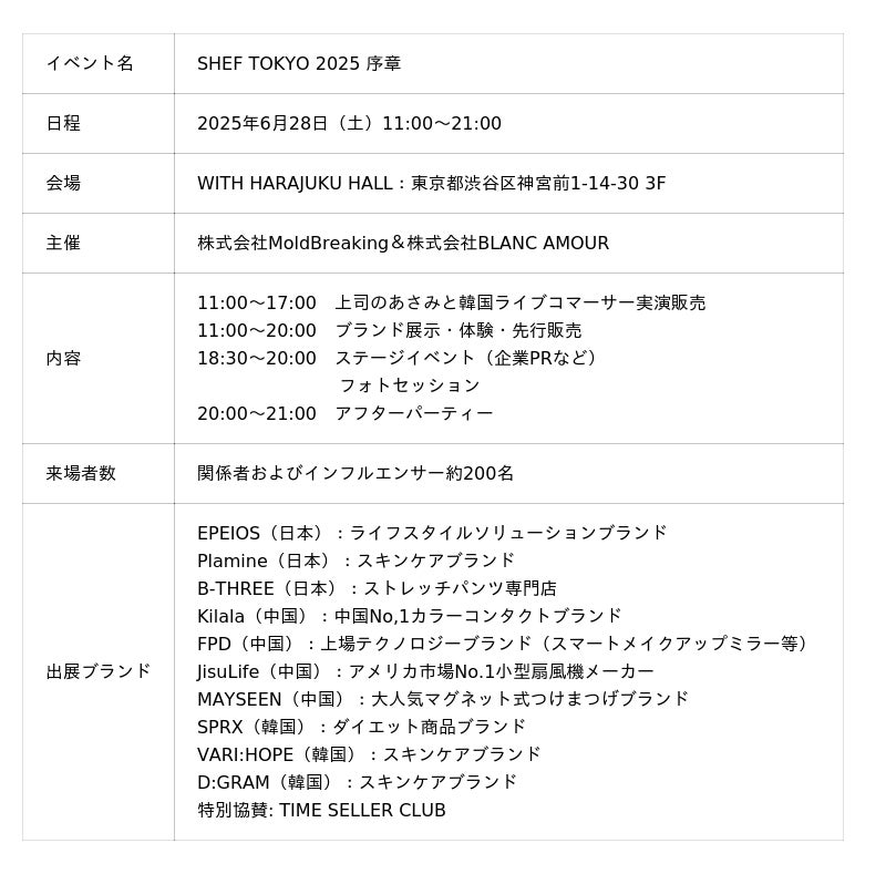 株式会社MoldBreaking(本社:東京都港区、FOUNDER&CEO:郭 兮若、以下当社)は、ブランドライブコマーサーを育成する株式会社BLANC AMOUR(本社:東京都港区、FOUNDER&CEO:原 朝未、以下BA社)とともに、2025年6月28日(土)、東京都原宿にて次世代ライブコマースイベント「SHEF TOKYO 2025 序章」を開催。日本・中国・韓国の注目ブランドとインフルエンサー150名以上が集結し、「ライブコマース元年」と呼ばれる2025年の幕開けを象徴するイベントとなりました。BA社代表兼ブランドライブコマーサー「上司のあさみ」によるライブコマースでは、わずか6時間で売上500万円を達成し、ライブコマースを通して欲しいものをディスカバリーする時代に突入しました。また、当グループは、“感情テックカンパニー”としての再出発を発表。AIoT技術を駆使し、10月末にローンチ予定の「感情に寄り添う次世代ショッピング体験」を初披露し、新たなビジョンを提示しました。