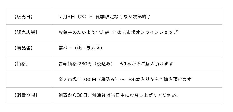 株式会社太陽社(所在地:千葉県匝瑳市飯倉293、代表取締役:片岡正裕)が展開する千葉県で長年愛される菓子店「お菓子のたいよう」から、夏の大人気アイス「葛バー」を2025年夏仕様にフルリニューアルし、期間限定で再発売いたします。