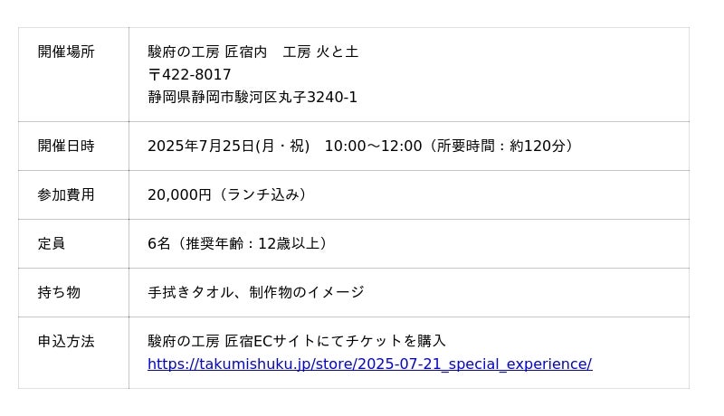 静岡市駿河区丸子の伝統工芸体験施設、駿府の工房 匠宿(株式会社創造舎、代表取締役:山梨洋靖)では、2025年7月21日(月・祝)、通常時には体験できない技法に触れる特別な陶芸体験イベントを開催します。