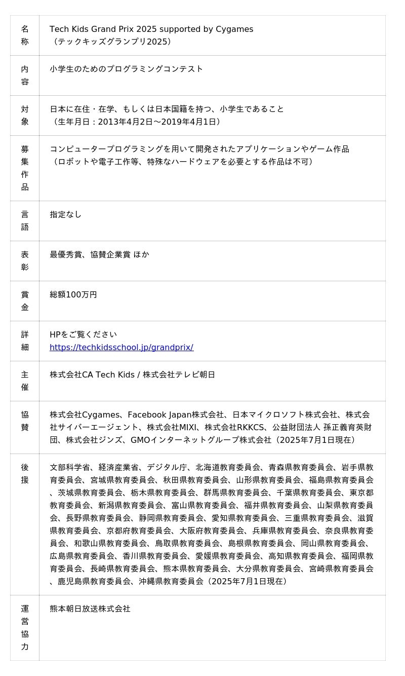 子ども向けプログラミング教育事業の株式会社CA Tech Kids(読み:シーエーテックキッズ、本社:東京都渋谷区、代表取締役社長:上野朝大)と、株式会社テレビ朝日(本社:東京都港区、代表取締役社長:西新、以下テレビ朝日)は、全国No.1小学生プログラマーを決めるプログラミングコンテスト「Tech Kids Grand Prix 2025」(ヨミ:テックキッズグランプリ2025)の応募受付を本日2025年7月1日(火)より開始したことをお知らせいたします。