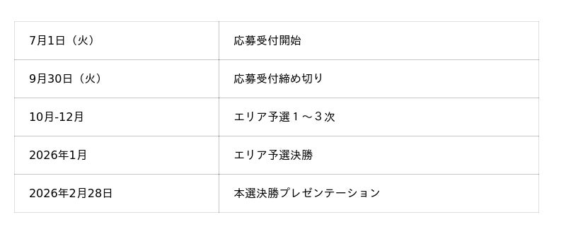 第8回大会となる2025年度大会は、7月1日(火)~ 9月30日(火)の期間中応募を受け付け、エリア予選1~4次審査の後、2026年2月28日(土)に東京渋谷にて本選決勝を開催いたします。