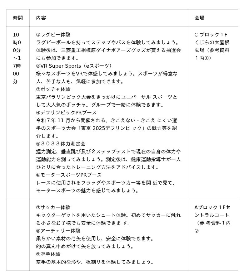県では、県民の皆様がスポーツを楽しみ、スポーツを始めるきっかけとなるよう、体験型のイベン トを実施します。ラグビーやボッチャ等のスポーツ体験、オリンピアンやスペシャルゲストによるス テージイベントなど見どころ満載です!この夏はみんなでスポーツを楽しんでみませんか!