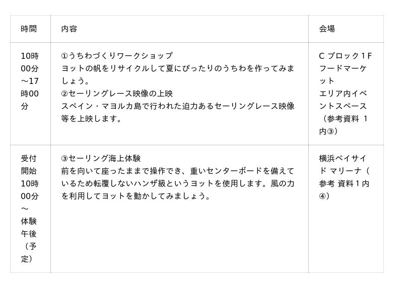 (注記1)セーリング海上体験については、横浜ベイサイドマリーナ(横浜市金沢区白帆1)で実施