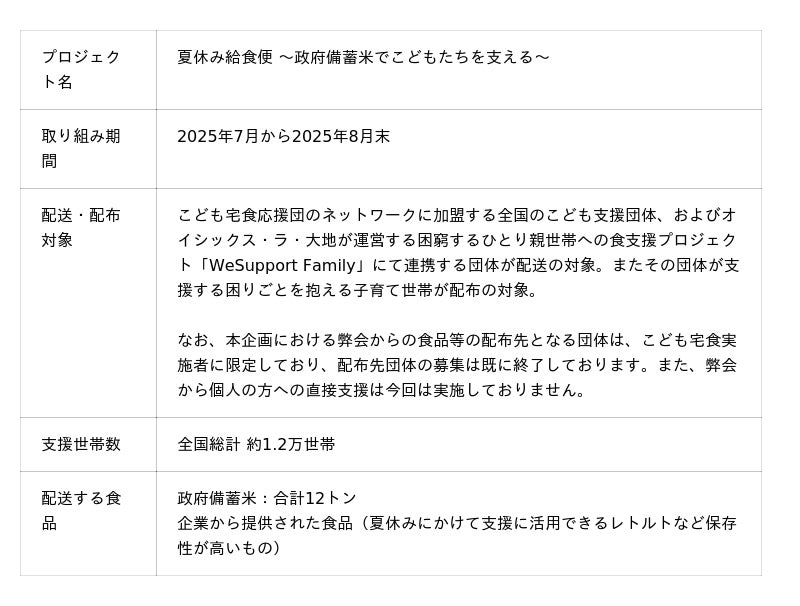認定NPO法人フローレンス(東京都千代田区、代表理事:赤坂緑)と一般社団法人こども宅食応援団(佐賀県佐賀市、代表理事:駒崎弘樹)は、特例認定特定非営利活動法人フードバンク愛知(愛知県北名古屋市、代表理事:宮尾久子)、WeSupport Family運営事務局のオイシックス・ラ・大地株式会社(東京都品川区、代表取締役社長:高島 宏平)と連携し、全国の困りごとを抱える子育て家庭約1.2万世帯に、政府備蓄米合計12トンをはじめとして食品を届ける「夏休み給食便 ~政府備蓄米でこどもたちを支える~」プロジェクトを実施します。