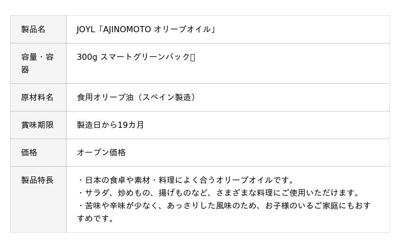 鮮度にこだわった日本の食卓によく合うオリーブオイル JOYL「AJINOMOTO オリーブオイル」ラインアップに300g スマートグリーンパック(R)を追加