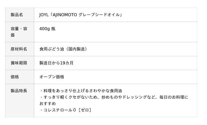 コレステロールゼロで、軽やかでクセのない味わいが特長 JOYL「AJINOMOTO グレープシードオイル」リニューアル
