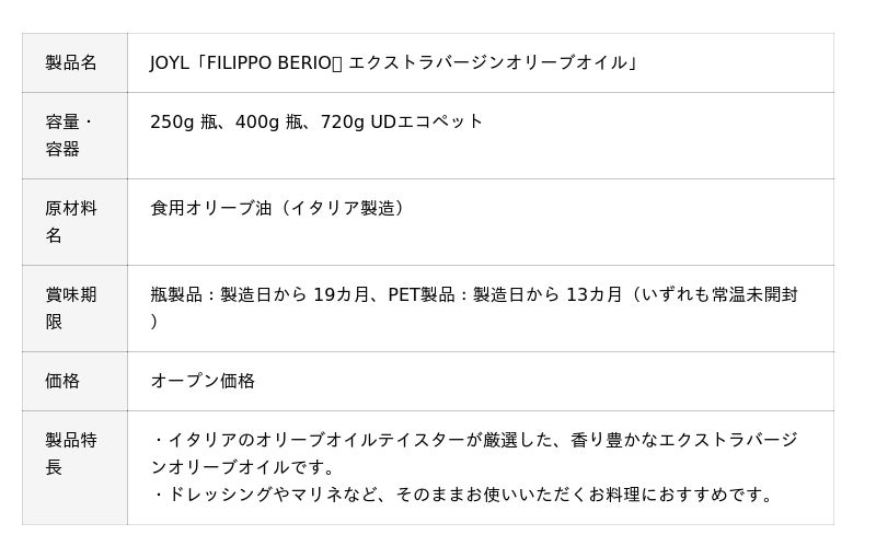 JOYL「FILIPPO BERIO(R) エクストラバージンオリーブオイル」は、イタリア現地のオリーブオイルテイスターが厳選した香り豊かなオリーブオイルを使用した、本格派の味わいが楽しめるエクストラバージンオリーブオイルです。ドレッシングやマリネなどそのまま料理にかけていただくことで、香りや味わいを楽しめます。