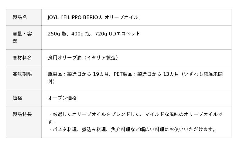 JOYL「FILIPPO BERIO(R) オリーブオイル」は、精製オリーブオイルとエクストラバージンオリーブオイルをブレンドした、マイルドな風味のオリーブオイルです。パスタ料理、煮込み料理、魚介料理など欧風料理に適しており、加熱・非加熱の両方で幅広くご利用いただけます。