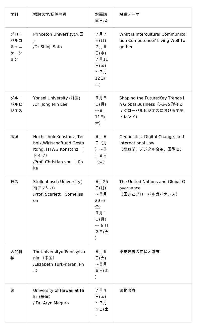 武蔵野大学(法人:東京都江東区、学長:小西 聖子)は令和7年7月~9月にかけて、全6学科で「International Lectures」を開催します。