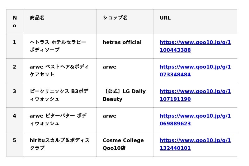 インターネット総合ショッピングモール「Qoo10」を運営するeBay Japan合同会社(本社:東京都港区、代表取締役:グ ジャヒョン)は、「ボディソープ」の販売数TOP5*を発表いたします。