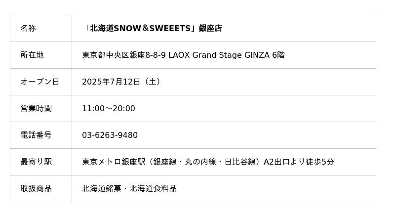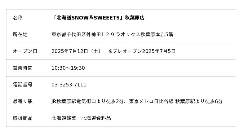 ラオックス・グローバルリテーリング株式会社 (本社:東京都港区 代表取締役:西井剛)は、北海道の商品を取り扱う 「北海道SNOW&SWEEETS」 を、2025年7月12日(土)に秋葉原と銀座の2店舗を同時オープンします。