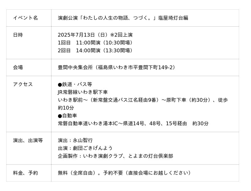 塩屋埼灯台活性化プロジェクト実行委員会(幹事社:いわき演劇クラブ)は、2025年7月13日(日)に、演劇公演「わたしの人生の物語、つづく。」塩屋埼灯台編を上演いたします。この公演は、日本財団「海と日本プロジェクト」の一環として、灯台を中心に地域の海の記憶を掘り起こし、地域と地域、異分野と異業種、日本と世界をつなぎ、新たな海洋体験を創造していく「海と灯台プロジェクト」の助成を受けて実施します。