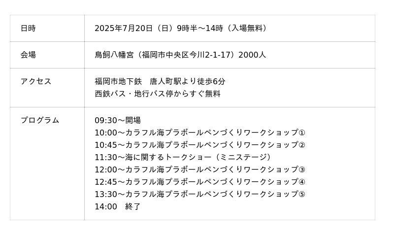 一般社団法人 海と日本プロジェクトinふくおかは、2025年7月20日(日)に開催される「福マルシェ」において、コラボ企画「海マルシェ」を共催します。2018年から福岡市内で毎月開催されている「福マルシェ」はにスタートし、地産地消が楽しめる大人気イベントですとして今や大人気の「福マルシェ」。福岡市内で毎月開催していま7月20日(日)今回、福岡市中央区の鳥飼八幡宮で開催される「福マルシェ」では、地元の海のグルメが楽しめる、<海と日本プロジェクトinふくおか>とコラボした「海マルシェ」が登場します!