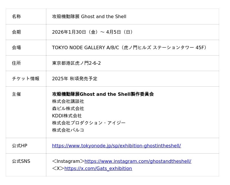 森ビル株式会社(東京都港区、代表取締役社長:辻 慎吾)は、攻殻機動隊展Ghost and the Shell製作委員会(株式会社講談社、森ビル株式会社、KDDI株式会社、株式会社プロダクション・アイジー、株式会社パルコ)の一員として、2026年1月30日(金)から4月5日(日)までの期間、虎ノ門ヒルズの情報発信拠点「TOKYO NODE(東京ノード)」にて、『攻殻機動隊展 Ghost and the Shell』を開催します。
