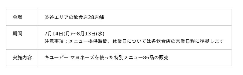キユーピー マヨネーズを使った特別メニューを渋谷の飲食店で提供するほか、SHIBUYA109渋谷店に巨大広告を掲示。7月19日(土)~21日(月・祝)の3連休にはイベントも開催
