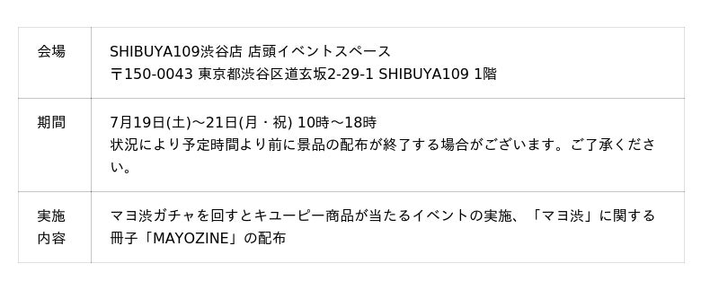 7月19日(土)~21日(月・祝)の3連休は、SHIBUYA109渋谷店の店頭イベントスペースにて、キユーピー商品などが当たるイベント「マヨ渋ガチャ」を開催します(参加費無料)。