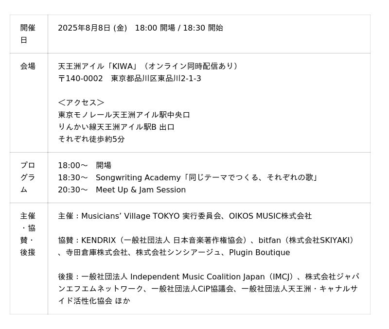 イベントの申込みと楽曲エントリーは本日よりスタートします。イベント参加は、今回からチケットサイトのLivePocketとMusicians' Village TOKYOのLINEアカウント(@musicvill_tokyo)にて受け付けます。