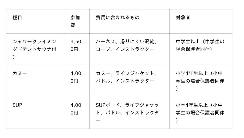 〇持ち物:着替え、タオル、帽子、飲み物、速乾性のある長そで長ズボン(シャワークライミングのみ)