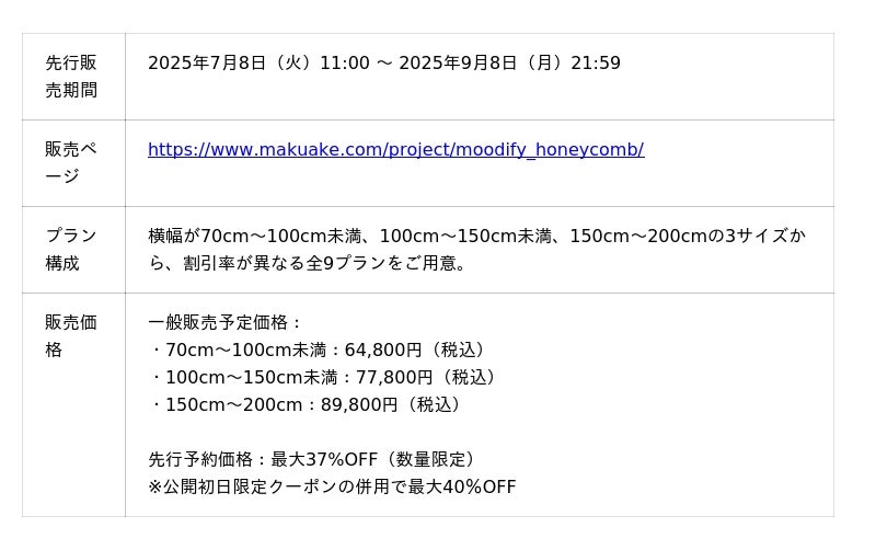 次世代スマートカーテンを展開する株式会社Moodify(本社:東京都荒川区、代表取締役CEO:松坂 星鏡)は、光・熱・音をスマートにコントロールする電動カーテン「Moodify電動ハニカムシェード」を、2025年7月8日(火)11時より応援購入サービス「Makuake(マクアケ)」にて先行予約販売を開始いたします。数量限定にて、一般販売価格の最大40%OFFでお買い求めいただけます。