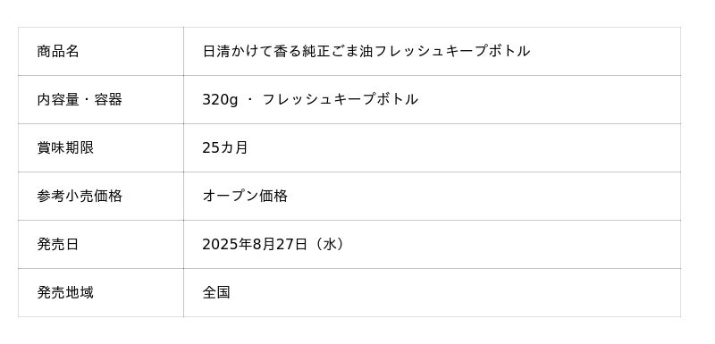 開封後も油を酸化から守る、鮮度長持ち「日清かけて香る純正ごま油」からフレッシュキープボトルの新容量タイプを追加発売