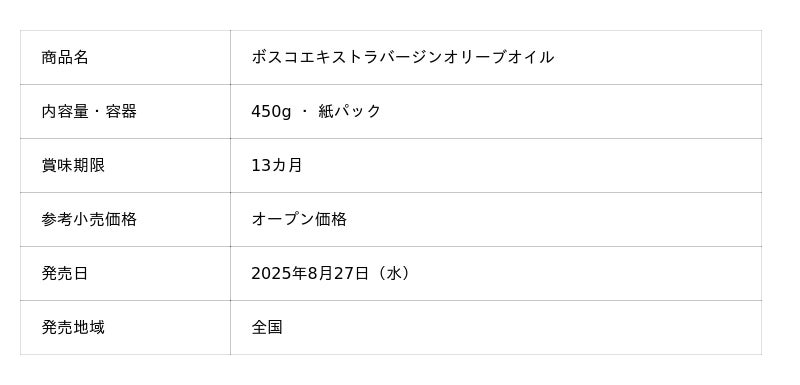 早摘みグリーンオリーブの風味を環境にやさしい容器でお届け「ボスコエキストラバージンオリーブオイル」から紙パックタイプを追加発売