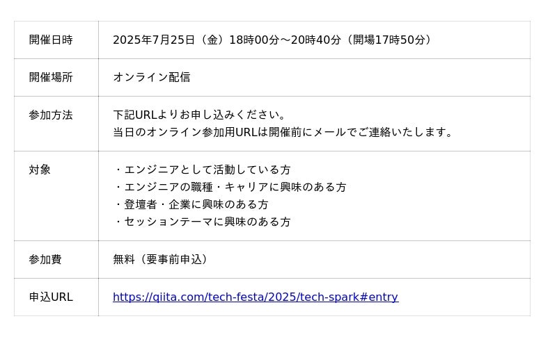 創造性と技術力で多様なITサービスを展開する株式会社エイチームホールディングスのグループ会社で、エンジニアに関する知識を記録・共有するためのサービス「Qiita(キータ)」を展開しているQiita株式会社(本社:名古屋市中村区、代表取締役社長:柴田健介)は、日本最大級のエンジニアコミュニティ「Qiita(キータ)」において、2025年7月25日(金)に無料ライブ配信イベント「Qiita Tech Spark 2025 (キータ テック スパーク 2025)」を開催します。