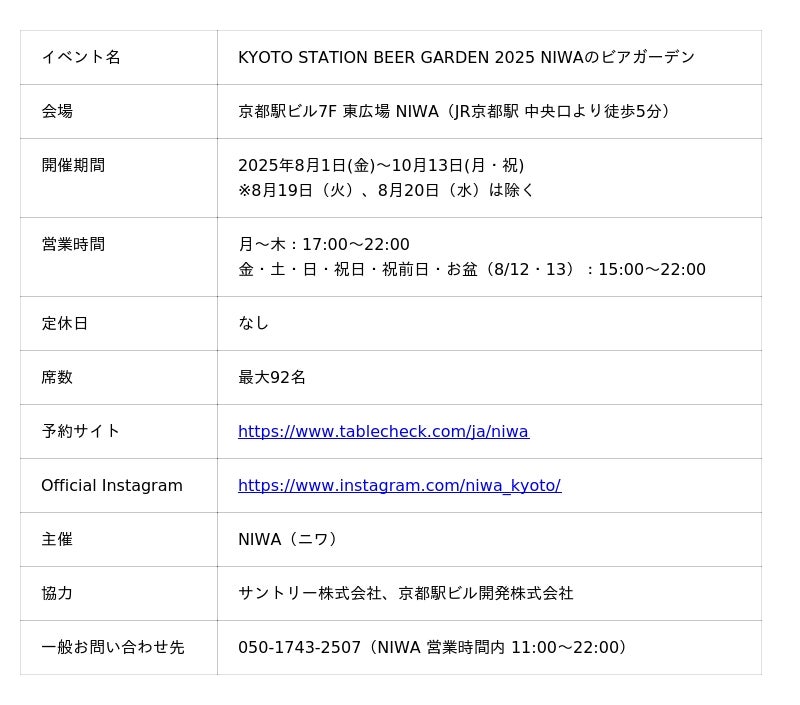 『KYOTO STATION BEER GARDEN 2025 NIWAのビアガーデン』2025年8月1日(金)~10月13日(月・祝) 開催決定