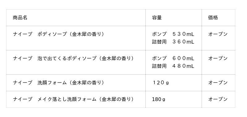 “家族みんなの肌を健やかに”というコンセプトのもと、人と家族を想い続けるブランド「ナイーブ」。季節の限定商品「金木犀の香り」はボディソープに加え、昨年初めて洗顔フォームを発売し、ご好評を頂きました。