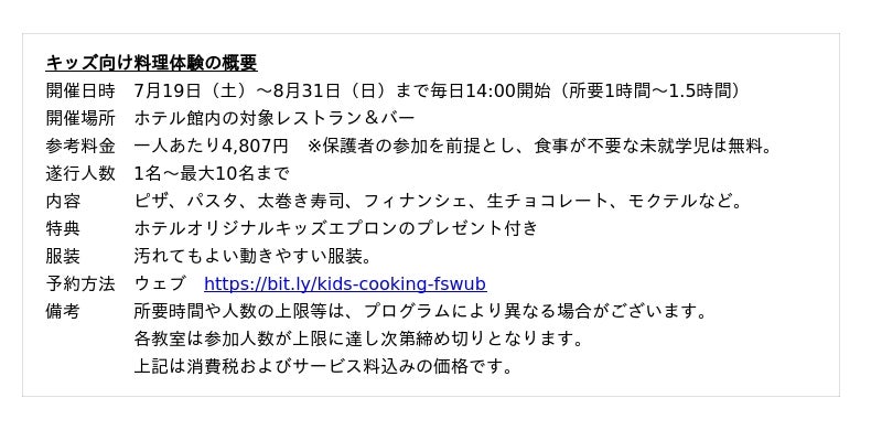 夏休み期間中、ホテル館内では親子で参加できるお子様向けの料理体験を毎日実施いたします。ホテルのシェフと一緒に料理を作る体験は、食育にも、ご家族の夏の思い出づくりにもぴったりです。