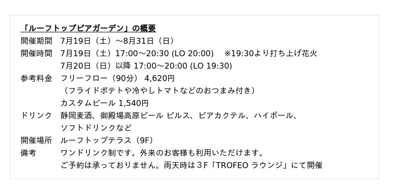 ホテル最上階のルーフトップテラスでは、今年も「ルーフトップビアガーデン」を開催。昨年は週末に満席になるほどの好評を博した本イベント。富士山と国際サーキット「富士スピードウェイ」を一望できる、類を見ないロケーションで、開放感溢れるひとときをお過ごしいただけます。