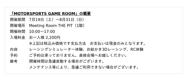 夏季限定「MOTORSPORTS GAME ROOM」でワクワクな時間を