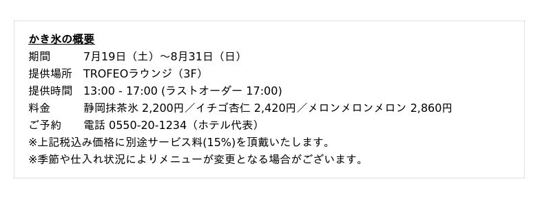 富士山の絶景を望む「TROFEOラウンジ」では、7月19日(土)から8月31日(日)まで、夏限定のかき氷3種を提供いたします。見た目にも色鮮やかなひんやりスイーツは、お子さまにも大人にも大好評。家族での午後のひとときや、ホテルにご到着時のクールダウンにもぴったりの一品です。