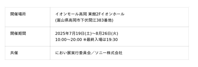 2025年7月19日(土)より富山県高岡市で開催される体験型イベント「におい展PLUS+」にて、ソニー株式会社のにおい制御技術を活用した体験展示がスタートします。香りを“視る・嗅ぐ・感じる”という多感覚体験を通じて、ソニー独自のテクノロジーが生み出す「香りの世界」をお楽しみいただけます。