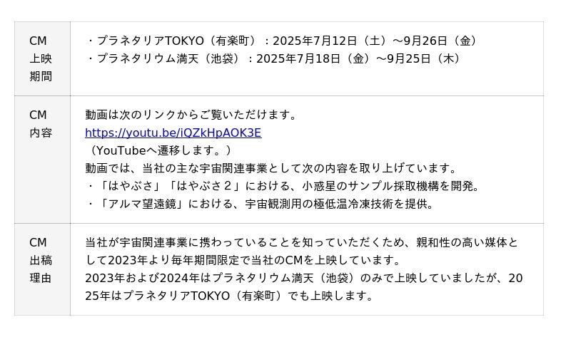 住友重機械工業株式会社(本社:東京都品川区、代表取締役社長:下村真司、以下「当社」)は、コニカミノルタプラネタリウム株式会社(本社:東京都豊島区、代表取締役社長:本由美子)が運営するプラネタリアTOKYO(有楽町)およびプラネタリウム満天(池袋)にて当社CMを上映します。