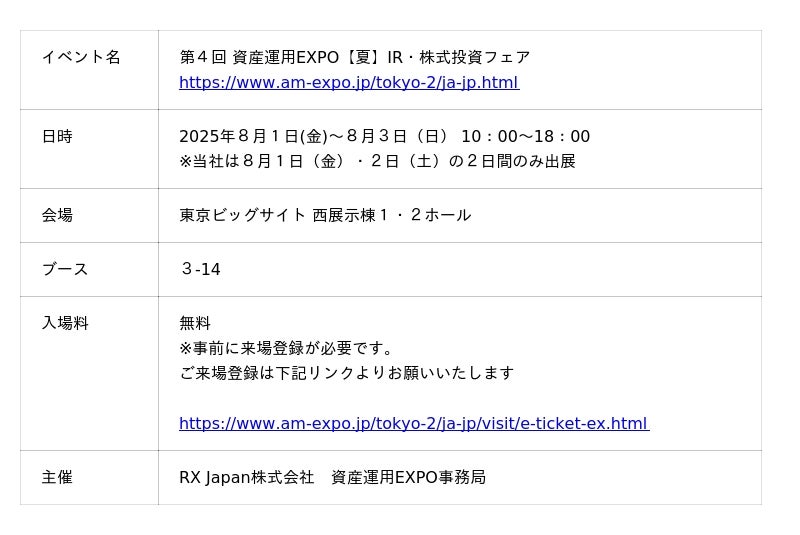 当社ブースは、8月1日(金)~2日(土)の2日間出展いたします。なお、2025年8月1日(金)14:30~14:55 には、同イベント内「資産運用セミナー」において、当社説明会も開催いたします。