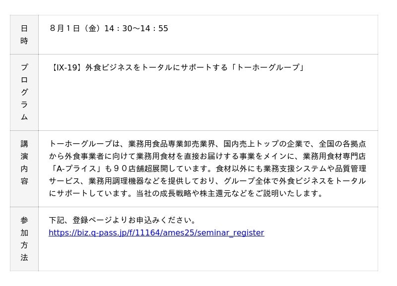 株式会社トーホー(本社:神戸市東灘区、代表取締役社長:奥野邦治)は、2025年8月1日(金)~3日(日)の3日間、東京ビッグサイトにて開催される個人投資家向けイベント「第4回 資産運用EXPO【夏】」内の「IR・株式投資フェア」に出展しますのでお知らせいたします。