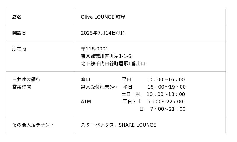 株式会社三井住友銀行(頭取 CEO:福留 朗裕、以下「三井住友銀行」)は、2025年7月14日に、三井住友銀行と三井住友カードの共同商品「Olive(オリーブ)」をモチーフとした新しいコンセプトの個人のお客さま向け店舗「Olive LOUNGE(オリーブ ラウンジ)町屋」を開設することを、お知らせいたします。銀行とスターバックス、SHARE LOUNGEが一体になった店舗として、多様な人が心地よく過ごせる場を目指します。