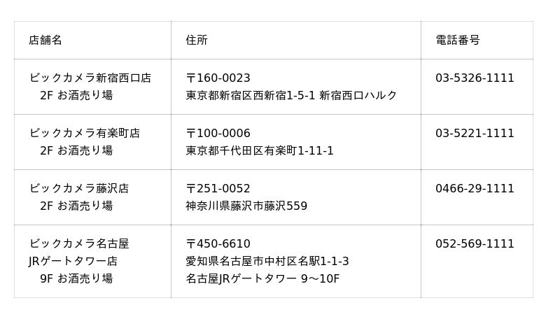 制度の発足に伴い、すでに研修を受講いただき、認定試験を突破したビックカメラグループのお酒コーナーを運営するビック酒販の5名の販売員を初代マイスターに認定し、以下の店舗での運用を開始いただきます。