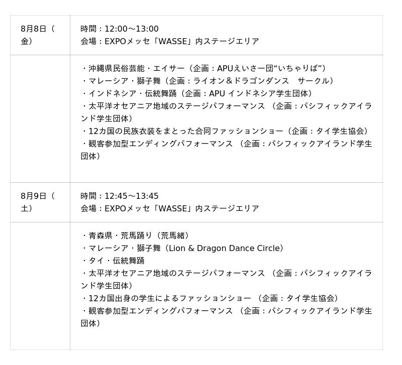 APUでは、キャンパス内で毎年開催している「マルチカルチュラル・ウィーク」を通じて、国・地域の垣根を超えた文化交流を学生自らが企画・運営しています。今回は、その活動を万博という国際的な学外へと場を移し、「いのちの遊び場 クラゲ館」のテーマである“いのちを高める”を、多様な文化の躍動感とともに発信します。