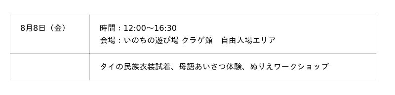 マレーシアの獅子舞や、沖縄・青森の郷土芸能、タイ舞踊やインドネシアの伝統舞踊などが繰り広げられ、フィナーレでは観客参加型のパフォーマンスも予定しています。 また、文化体験ワークショップでは民族衣装の試着、伝統楽器の演奏体験、ゲームなどを通じて、来場者五多文化に触れる機会を提供します。多国籍な学生たちが、創意工夫と情熱をもって準備してきた本イベントは、「いのち」「多様性」「共生」を感じられる貴重な機会となります。