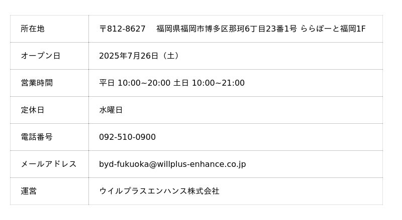 BYDの日本法人であるBYD Auto Japan株式会社(本社:神奈川県横浜市、代表取締役社長:東福寺 厚樹、略称:BAJ)の正規ディーラーであるウイルプラスエンハンス株式会社(本社:東京都港区、代表取締役会長:成瀬 隆章)は、2025年7月26日(土)に、全国で44店舗目、福岡エリア2店舗目となるショールームを備えた正規ディーラー店舗「BYD AUTO 福岡」をオープンします。