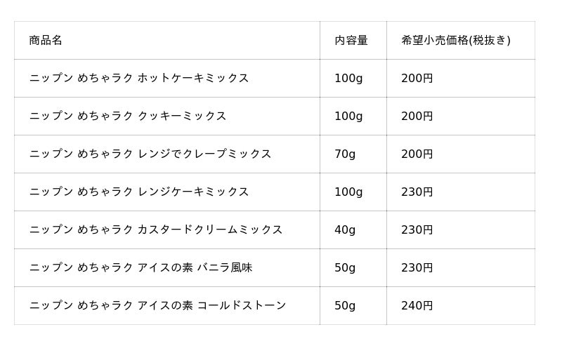 「ニップン めちゃラク」シリーズは、手軽に楽しくおいしいお菓子作りを応援するプレミックスです。2019年秋に発売した「ホットケーキミックス」からスタートし、現在は「クッキーミックス」「カスタードクリームミックス」など全7品をラインアップしています。